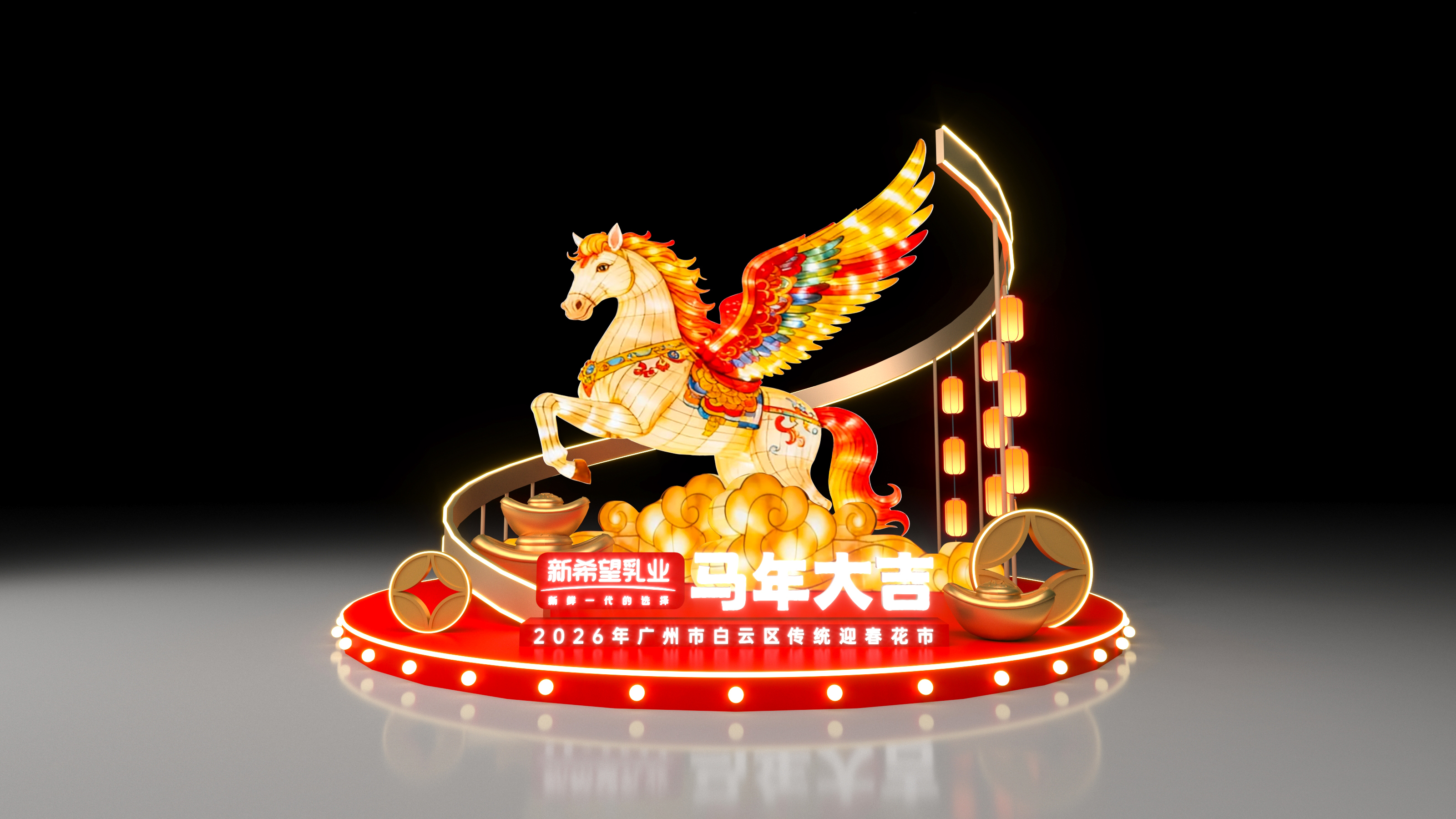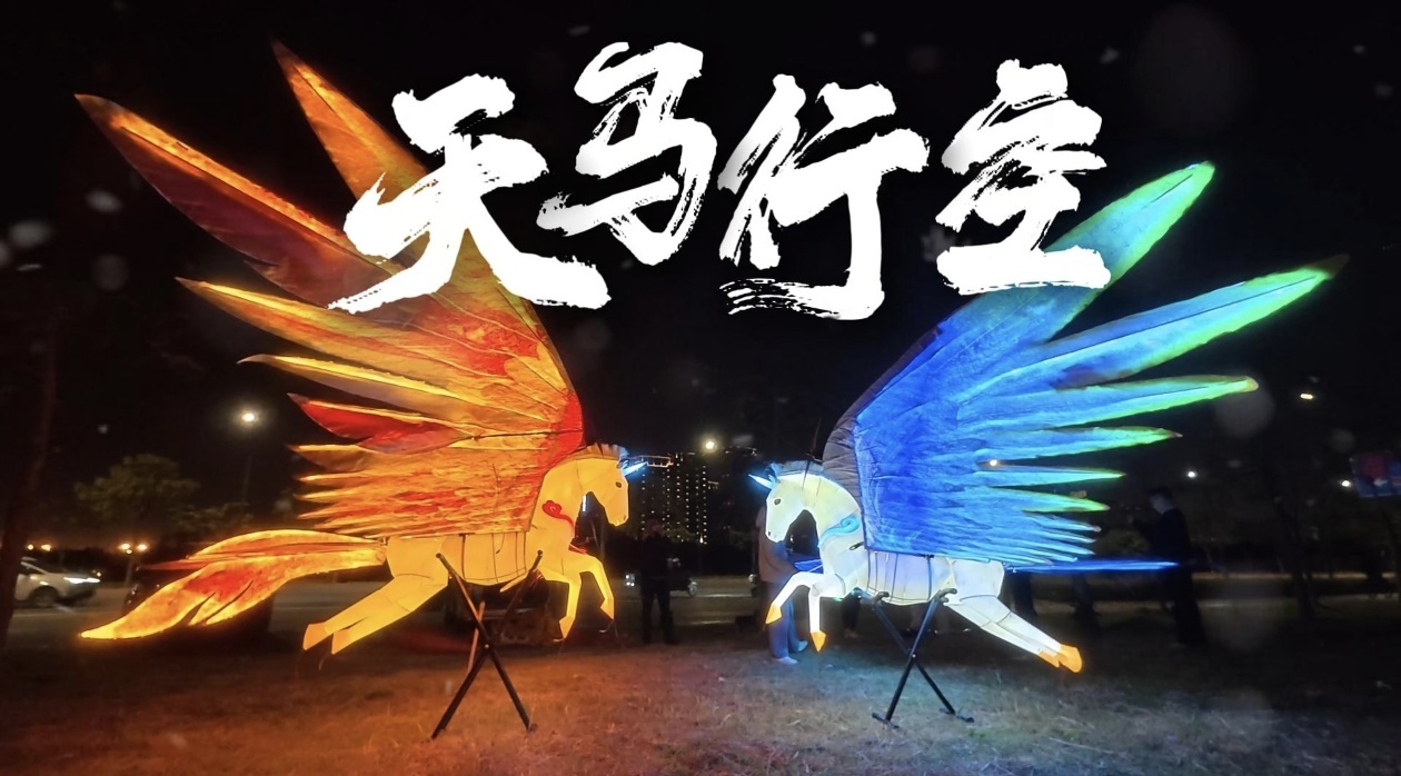 除了天上“飞马”,大地也有巨型飞马花灯安设傲然挺立,骏马展翅欲飞、脚踏元宝,寓意“飞快生财”,新春喜庆氛围感拉满。天上飞马踏云而来,地下奇骏送福纳财,宇宙相映的马“味”盛景,为市民巨匠打造唯独无二的新春体验。