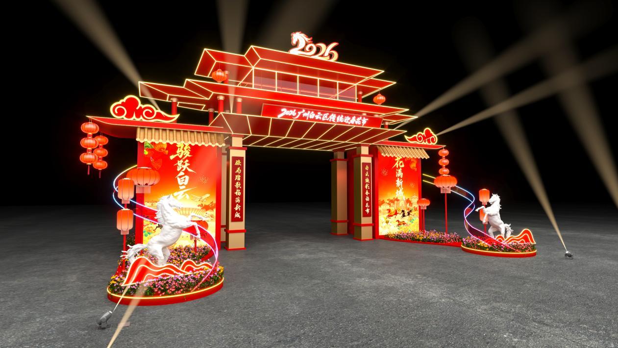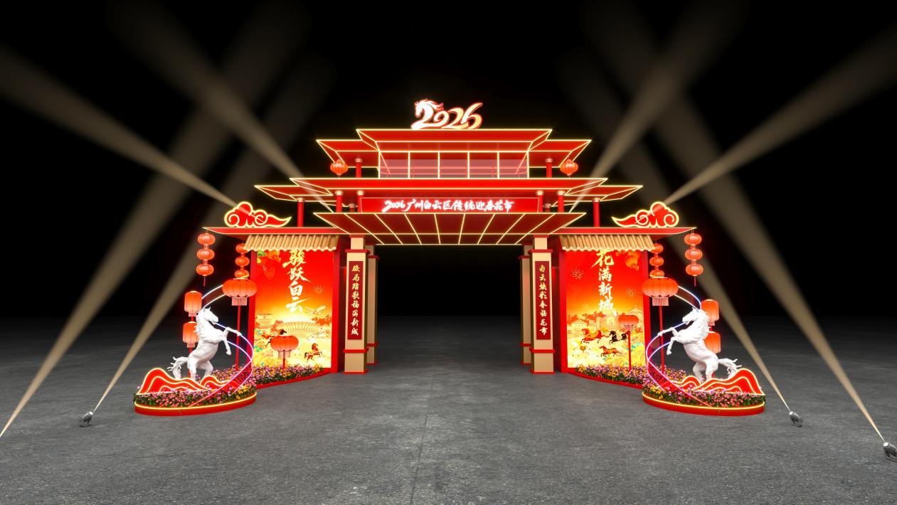 2月1日至10日,亚太经合组织(APEC)2026年第一次高官会及联系会议在广州召开,主会场选址在位于白云区的白云国外会议中心国外礼堂。行动2026年APEC第一次高官会的蹙迫方位,见证了白云乃至广州的国酬酢往风姿。而本次白云花市牌坊狡计,精确萃取白云国外礼堂秀气性的层叠飞檐元素,搭配朱红斗拱与鎏金灯带,既有广府传统成立的斯文底蕴,又兼具当代地标成立的大气质感。还特邀文豪和会白云特质、马年元素与传统文化,量身打造牌坊对子、并躬行挥毫题写,为牌坊增添墨香雅韵。